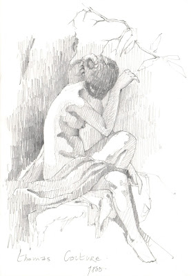 Une seconde étude est ensuite faite à partir d'une peinture de Thomas Couture, qui fut pendant plusieurs années le professeur de Manet. Je commence par une esquisse très simple pour construire mon sujet. Sans trop me soucier cette fois des qualités graphiques, je me concentre sur la recherche des formes. Avec un tracé très léger je vais progressivement me rapprocher de la forme du modèle. Les grandes lignes en place je peux ensuite appuyer mon tracé.