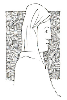 J'applique ensuite la "recette grecque" à un autre sujet. Ici je propose le dessin de la statue d'une vierge en majesté du 12ème siècle, puis le profil d'une femme toujours à la manière grecque, en stylisant visages et drapés.